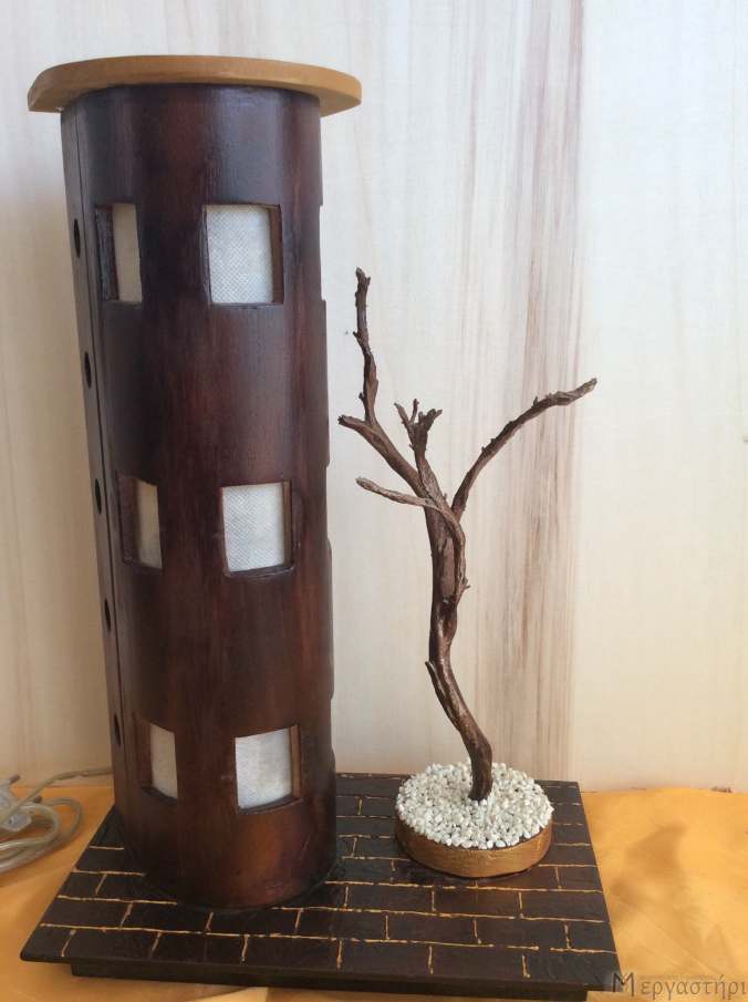 Ξύλινο επιτραπέζιο φωτιστικο ύψους 39cm,με λευκές ψηφίδες κι ένα αποξηραμένο δεντράκι.