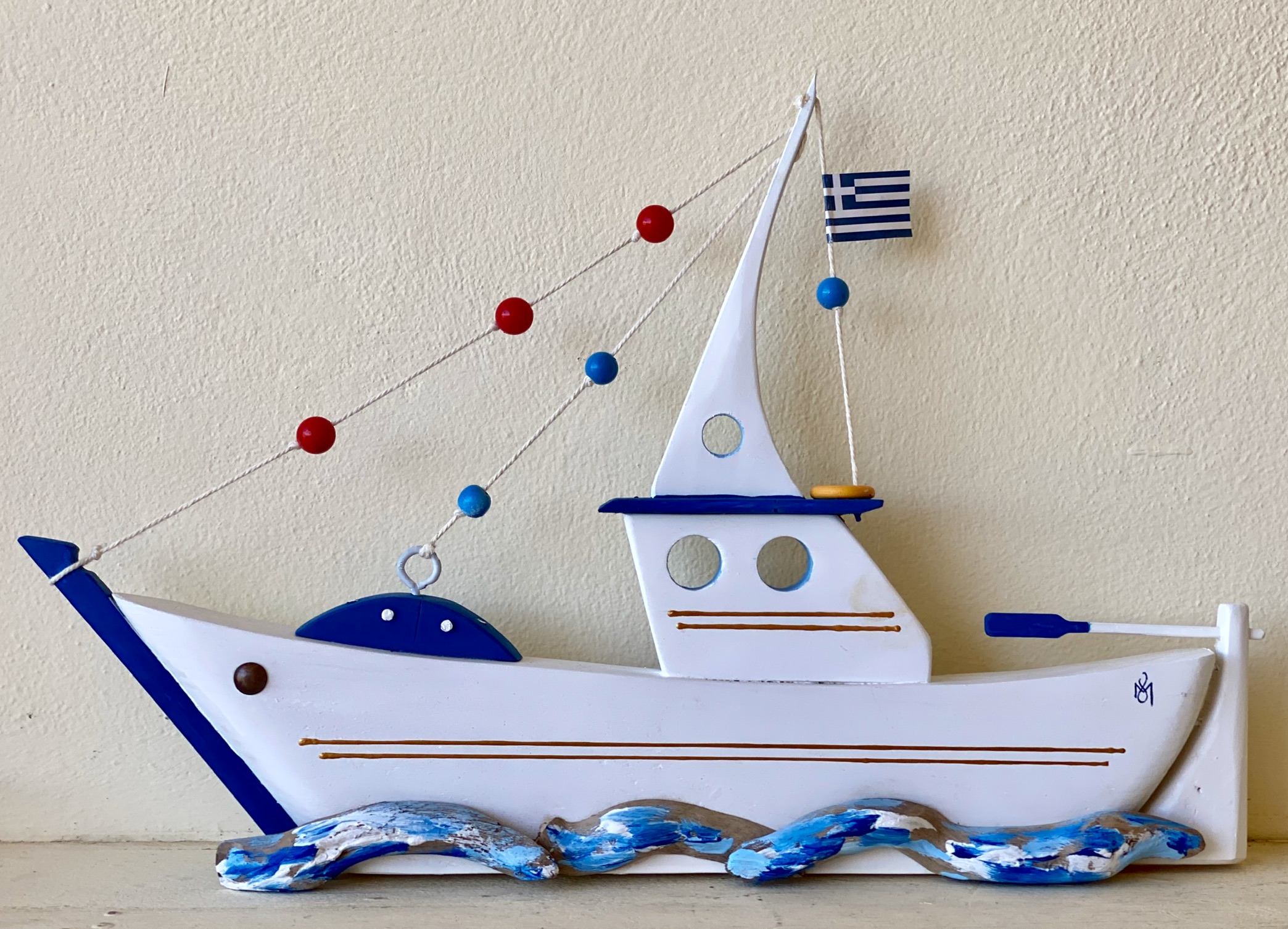 Επιτραπέζιο ξύλινο βαρκάκι μήκους 45εκ με θαλασσοξυλα και αλλα υλικά