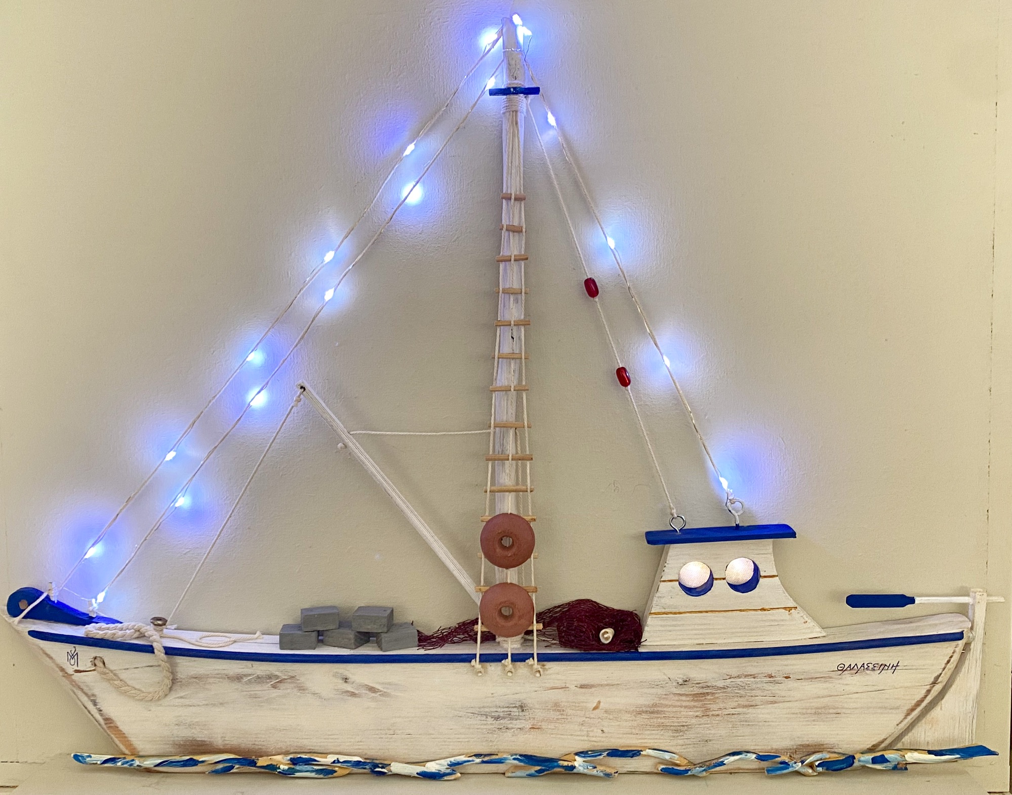 Ξύλινο επιτραπέζιο χειροποίητο καΐκι 75Χ55 με φώτα λεντ μπαταρίας.