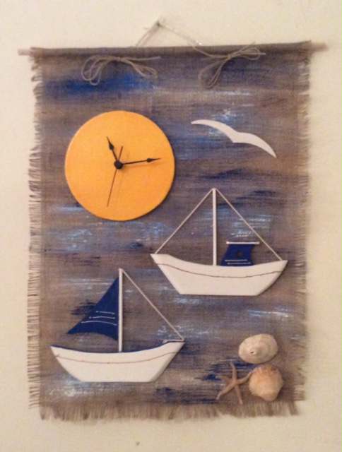 ρολόι τοίχου φτιαγμένη από λινάτσα και κοχύλια
