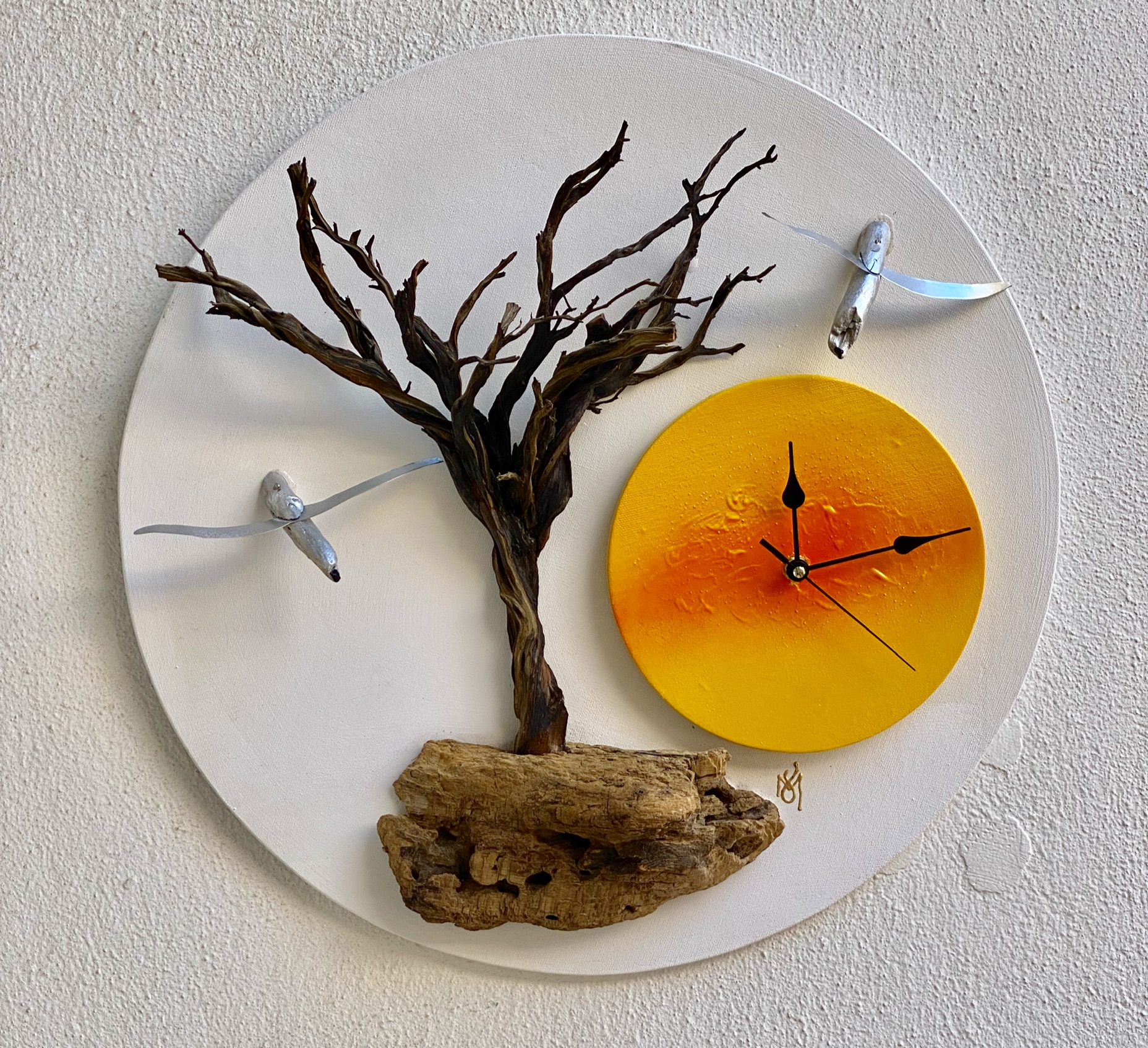Στρογγυλό χειροποίητο Ρολοι τοίχου 50εκ με ξύλο,αποξηραμένο θάμνο και αλλα υλικά.