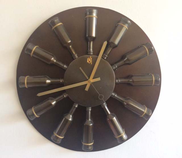 ρολόι 45 εκατοστών κατασκευασμένο με γυάλινα μπουκάλια και ξύλο